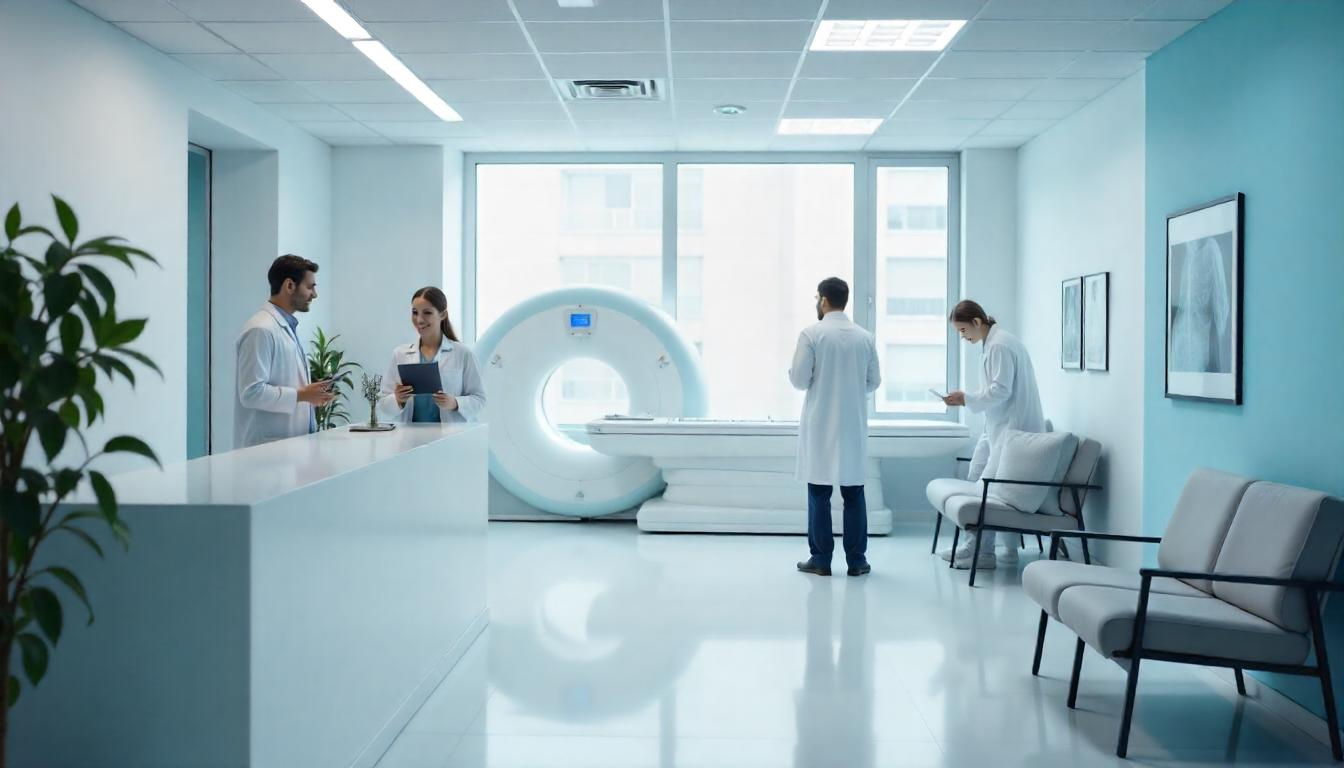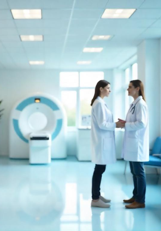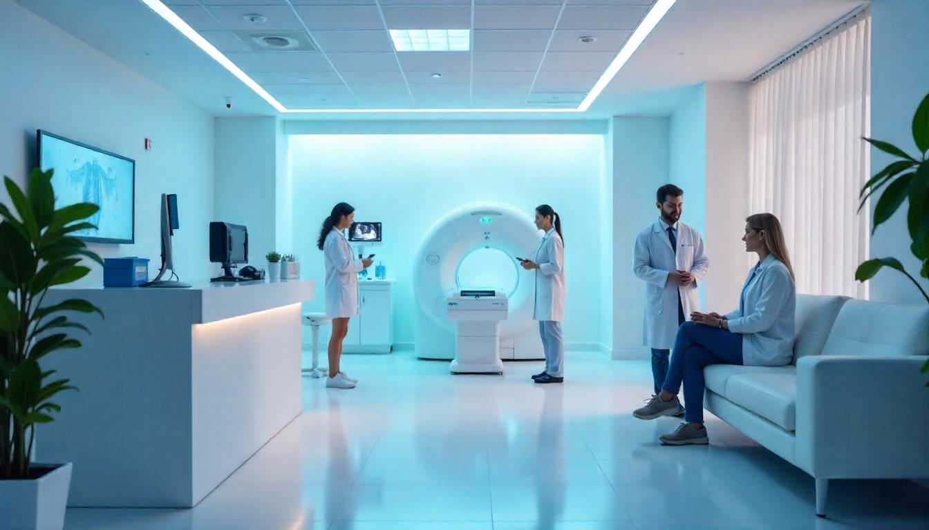 A patient undergoing an MRI scan with a healthcare professional present in a modern medical facility.